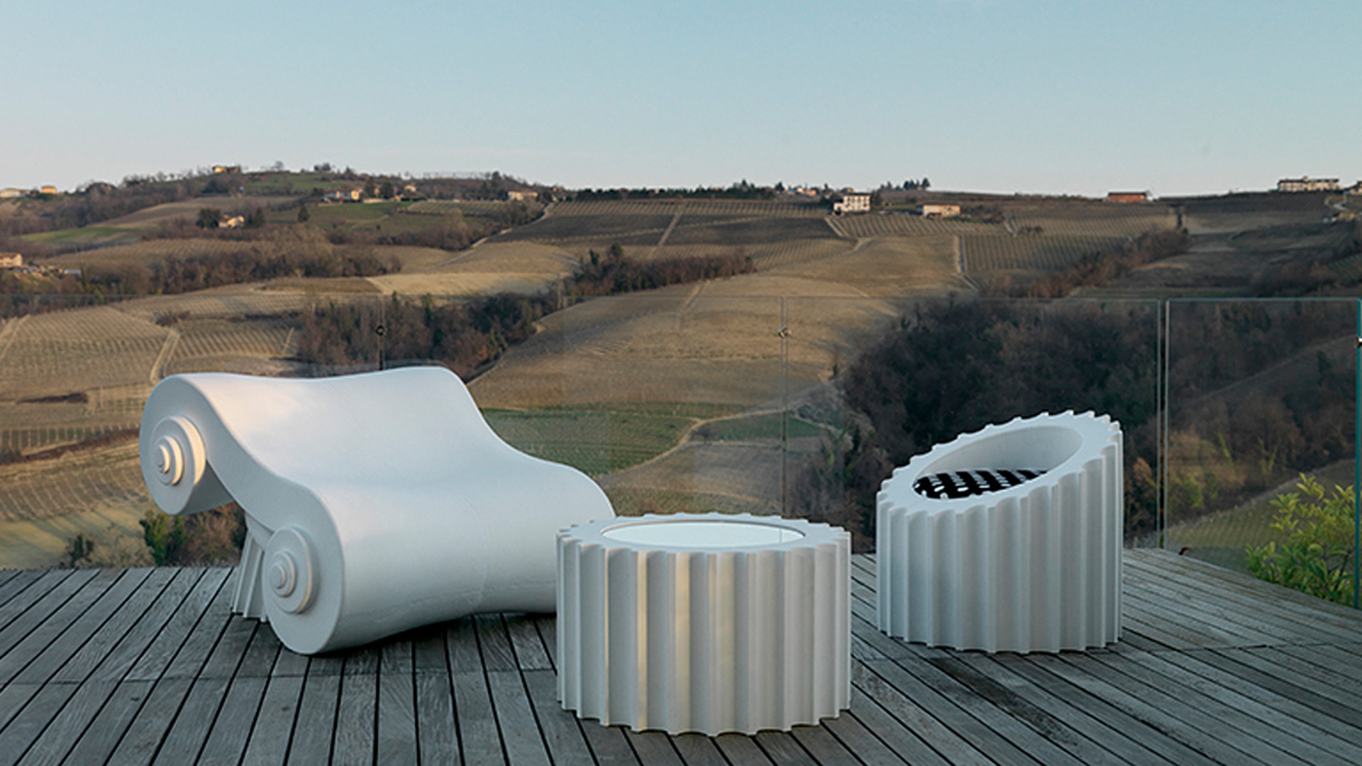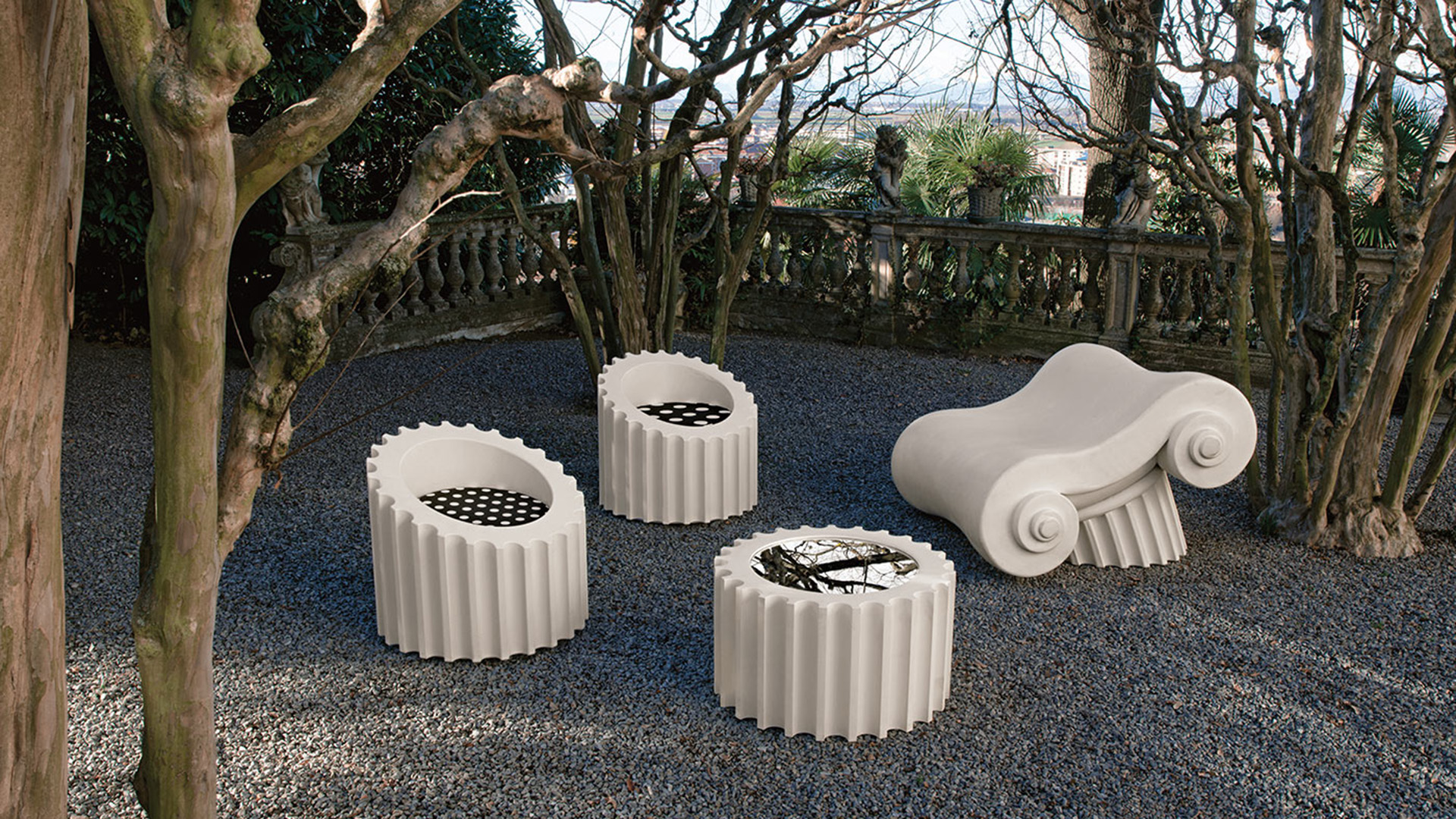 What happens if a Majestic Greek column falls down and breaks into several pieces? The answer is obvious: it is transformed into a Gufram lounge. The Ionic volute, which is the upper part of the column and called Capitello, becomes a luxurious chaise lounge.