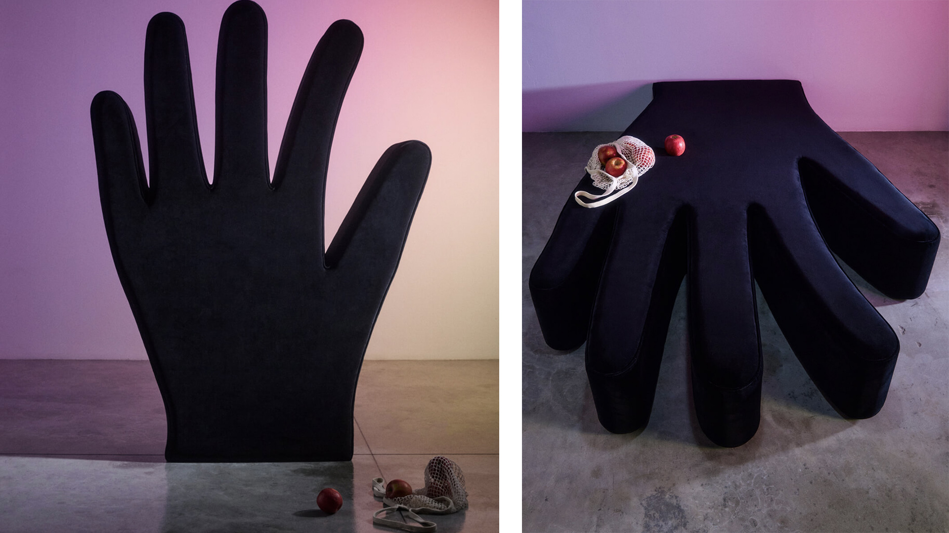 An open hand standing on itself to be interpreted as an intimidation to stop, an informal greeting or, if placed horizontally, a tentacled chair.