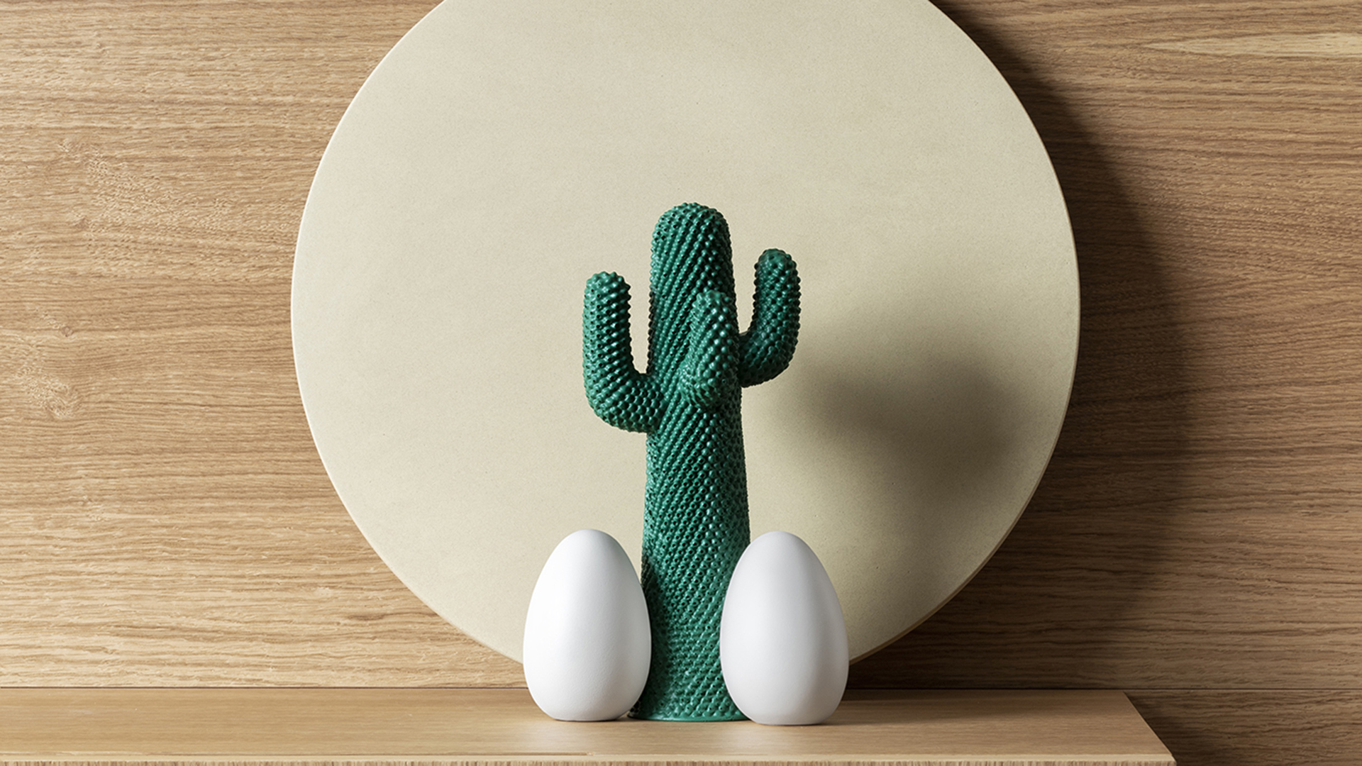 Appearing for the first time in 2012 on the provocative cover of the magazine TOILETPAPER No.7, GOD is a pagan idol deriving from the union of Cactus – designed by Drocco and Mello in 1972 – and the eggs of La Cova, the oversized nest created by Gianni Ruffi in 1973. The mini-Cactus – in the same emerald green that has always characterised GOD – includes all of the 2.165 bumps that decorate the stem and arms of this dreamlike coat hanger; the two eggs, which in the original version are covered in fabric, are instead made of polyurethane and finished by hand.
