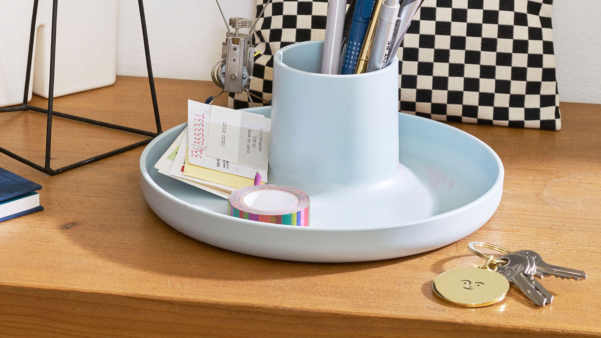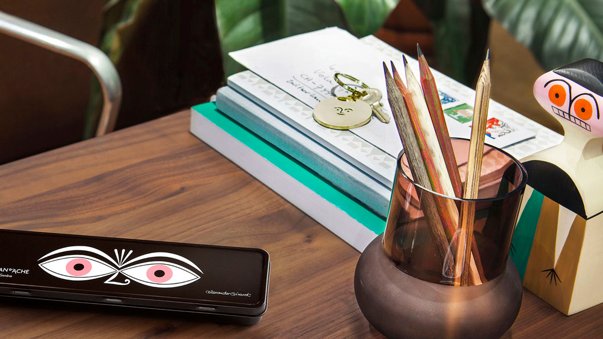 Along with his colleagues Charles and Ray Eames and George Nelson, Alexander Girard was one of the leading figures in American design during the postwar era. While textile design was the primary focus of Girard‘s oeuvre, he was also admired for his work in the graphic arts as well as furniture, exhibition and interior design. Girard brought a sensuous playfulness to twentieth-century design that had been absent from the austere aesthetic of classic modernism. On his extensive travels, Girard avidly collected textiles and folk art from all over the world. He bequeathed a major portion of these objects to the Vitra Design Museum in 1993, together with the contents of his studio, which encompassed hundreds of drawings, prototypes and samples. One of the graphic designs in the museum holdings depicts a smiling sun. Created by Alexander Girard for various applications, it has been selected by Vitra in cooperation with the Girard family as a motif for a metal key ring.