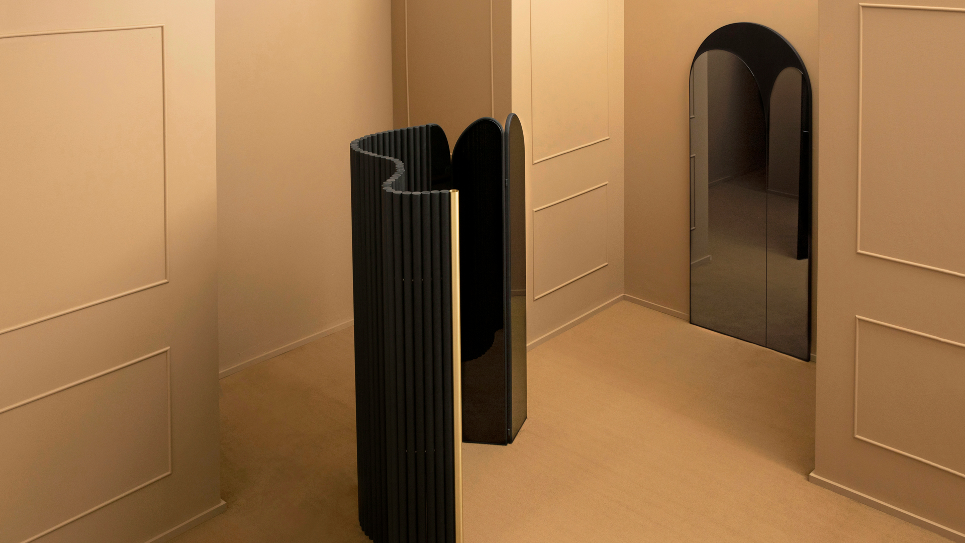 An arch shape, thematic in Bower's work, is completed with a grey tinted mirror, filling in the negative space beneath each of the swallow's wings.