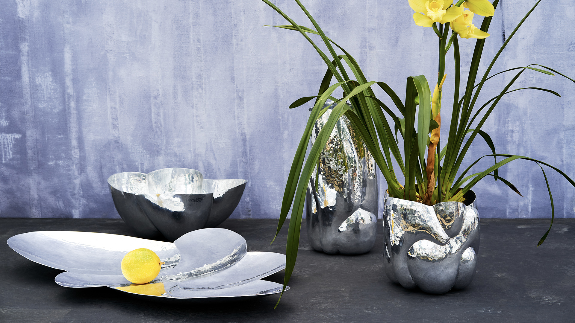 The marks from the maker – every hammer and indentation from stretching and warping the metal are preserved in the final product to reflect the amount of work that’s gone into the design. The organic shapes are reminiscent of seedpods and can be used for a variety of purposes, such as a vase, fruit bowl, and champagne bucket.