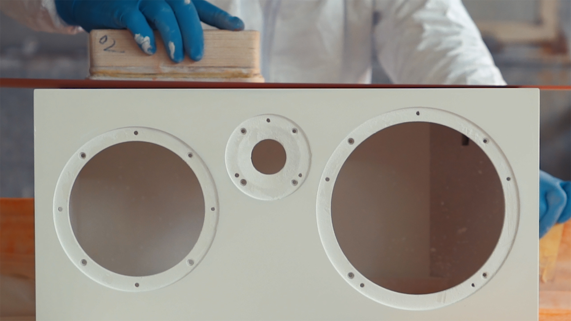 Each speaker is equipped with a 2-and-a-half-way speaker system (one mechanical reflex loading woofer, one mid-woofer and one tweeter). By leaving the speakers in their rotating supports, the distance between them is sufficient to ensure excellent sound quality.