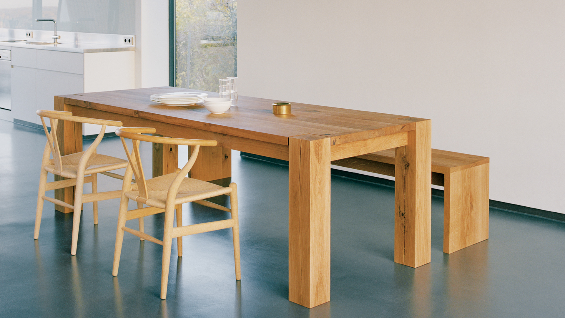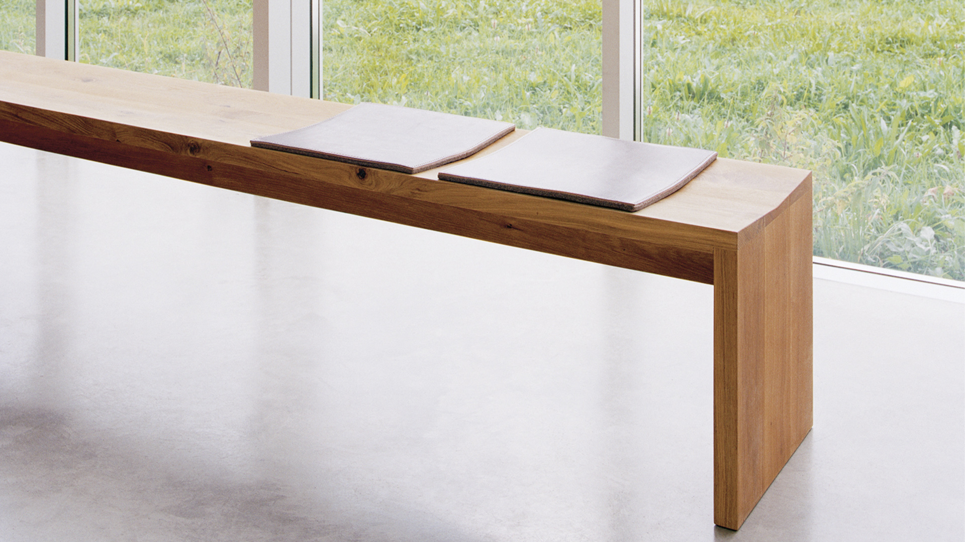 The solid wood bench CALLE consists of a contoured seat, two sides flushed with the seat and a support beam underneath.