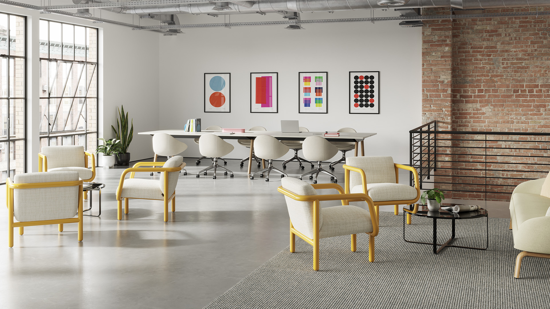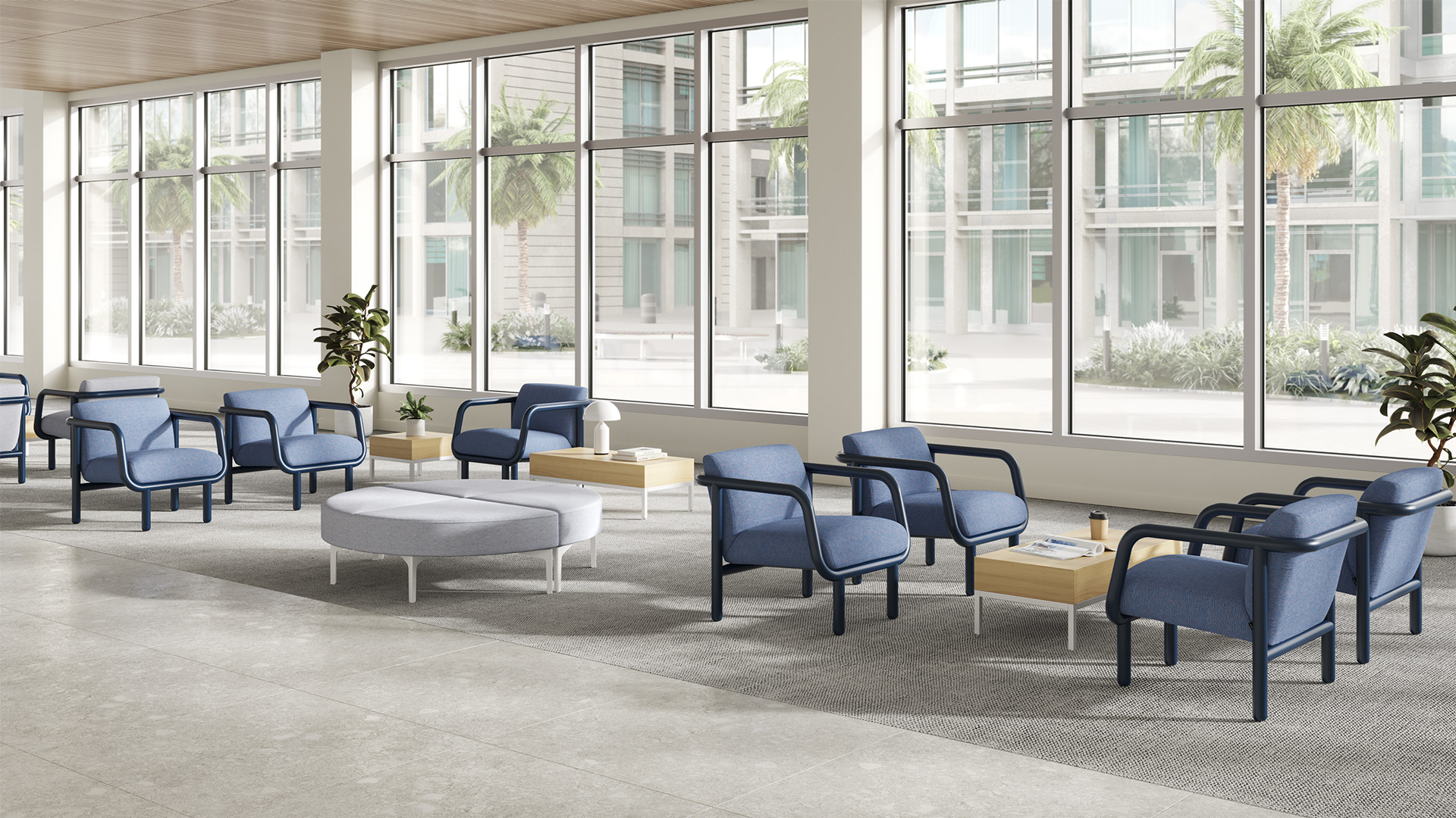 Inspired by the simple and functional design of mid-century waiting room chairs with their uninterrupted flowing lines, this practical and playful lounge chair contrasts plush upholstery with a visually graphic metal frame.
