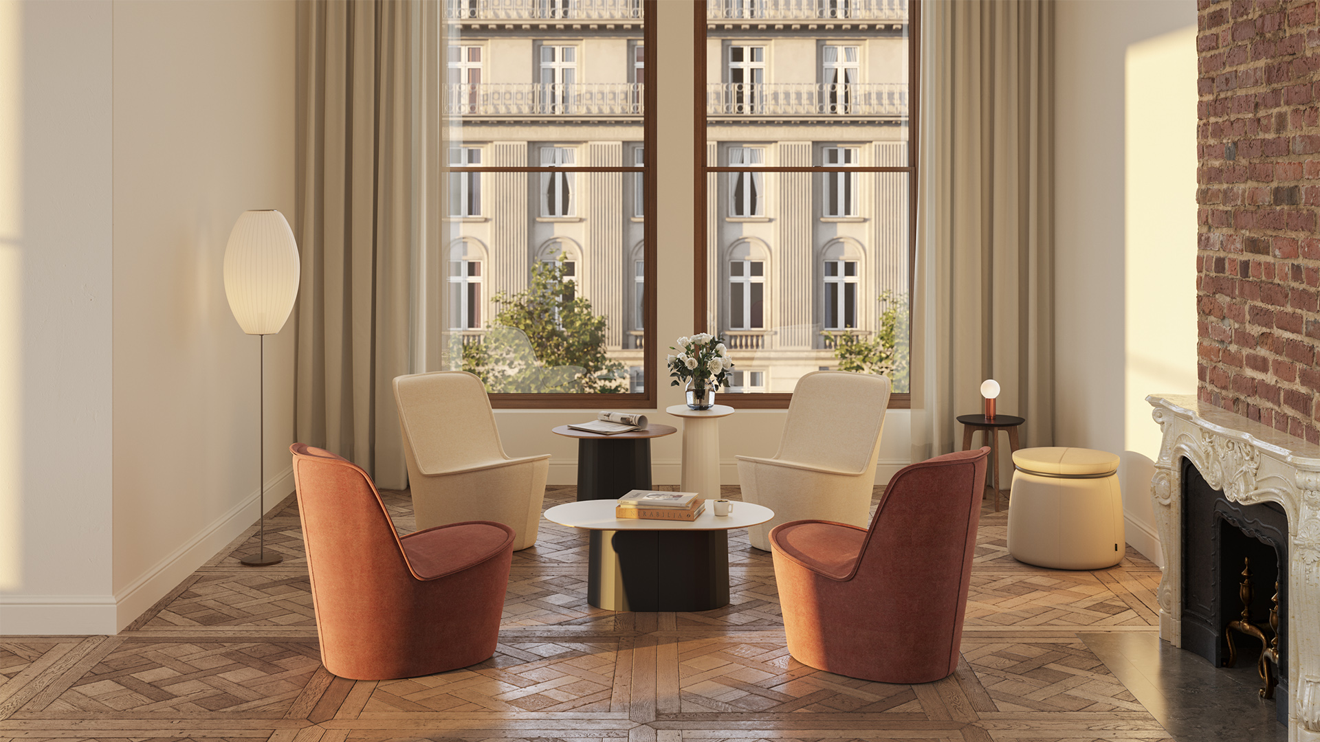Compact yet solid and stable, Pippin provides upholstered comfort and cupped support that invites longer interactions. At the same time, it readily moves as and where it needs to: it’s set on wheels and it comes with a convenient strap handle that facilitates movement while adding a playful touch.