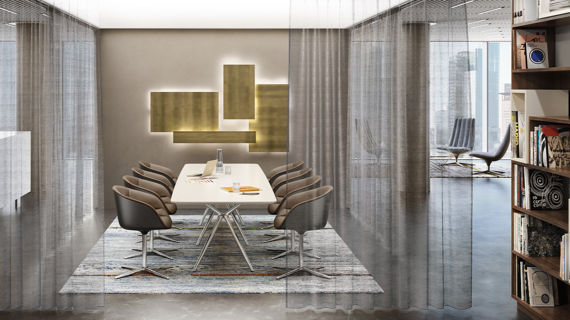 Striking seams structure the upholstery – sweeping and elegant like the seats of a sports car. Its shell – on the outside, like the original, in plastic or completely covered with leather – ensures exceptional seating comfort. With a slight swivel action on the four-star base or the tubular steel base, Kyo offers new perspectives whichever way you look at it.