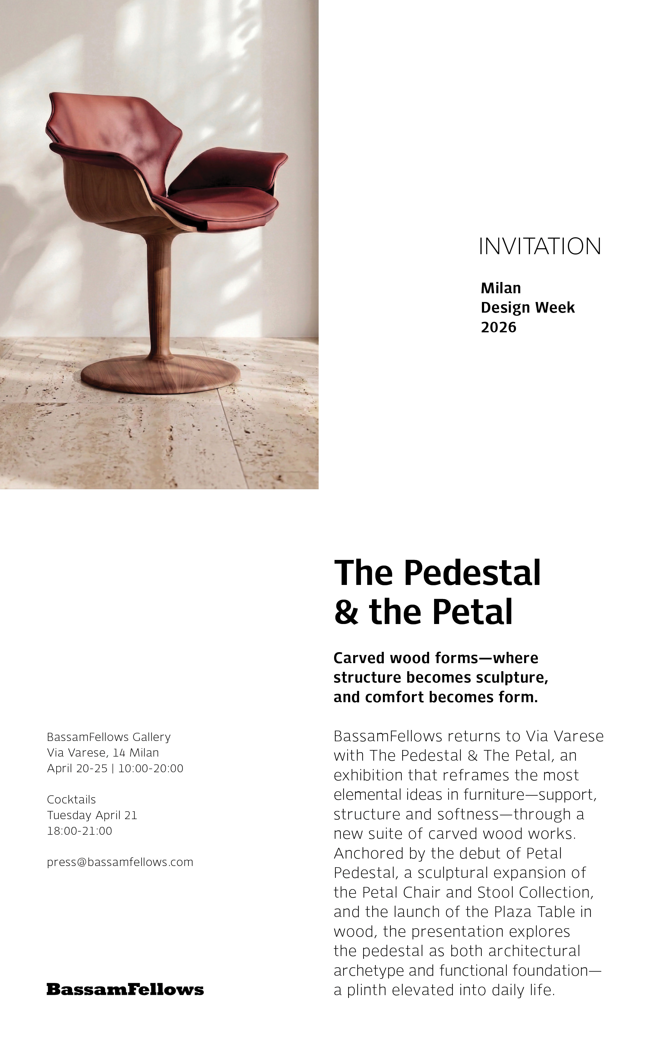 An exhibition exploring structure, support and softness through new carved-wood pieces, The Pedestal & The Petal highlights the debut of the Petal Pedestal and a timber edition of the Plaza Table.