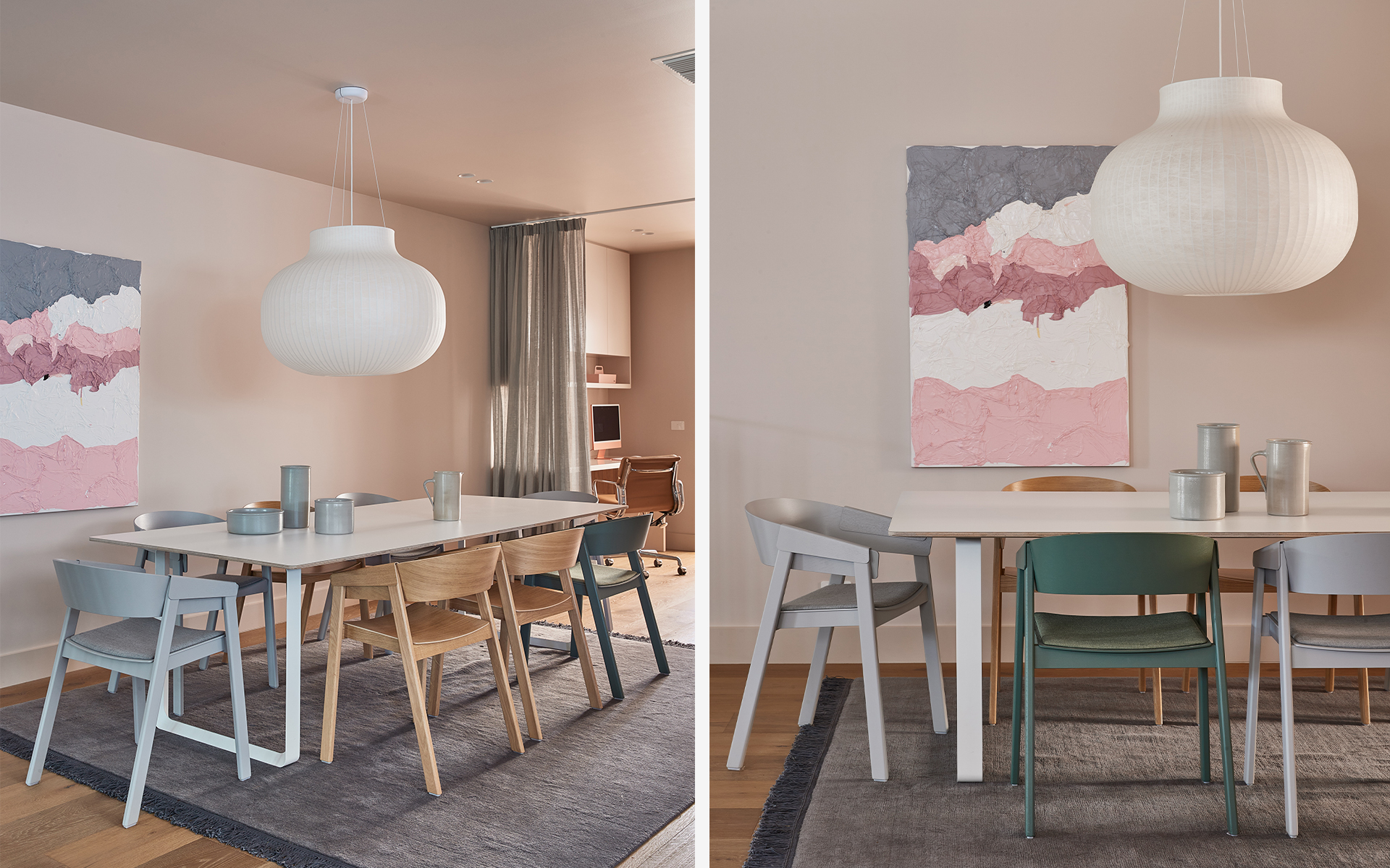 In the dining space, Muuto Cover Chairs were utilised in a playful colour range, seated around Muuto's 70/70 Table. For the chairs, a mix of green, grey, and oak timber, some were upholstered with matching coloured seat cushions. The home office is curtained off from the open plan living/dining space in the same pinkish tone, home to the Eames® Soft Pad Management Chair customised in tan leather and a minimal Muuto Tip Lamp for light.