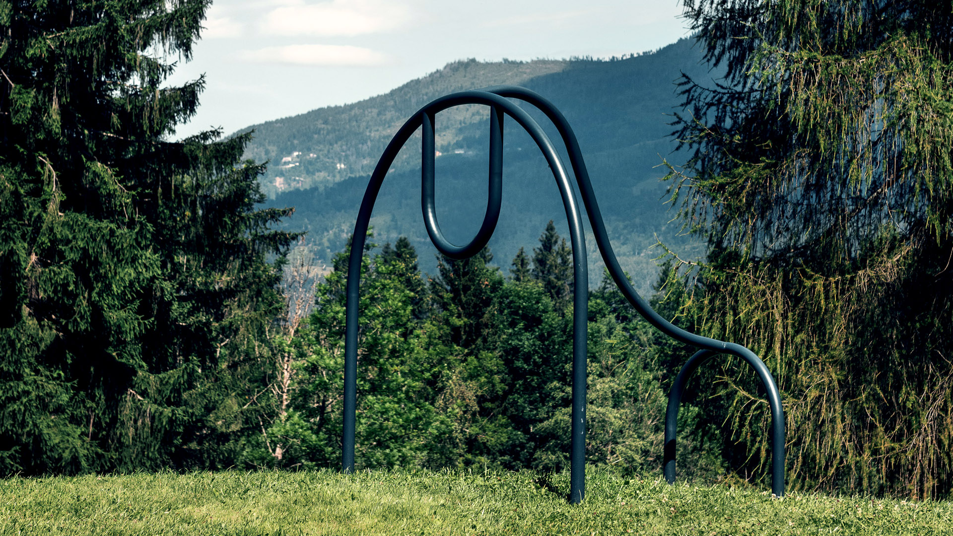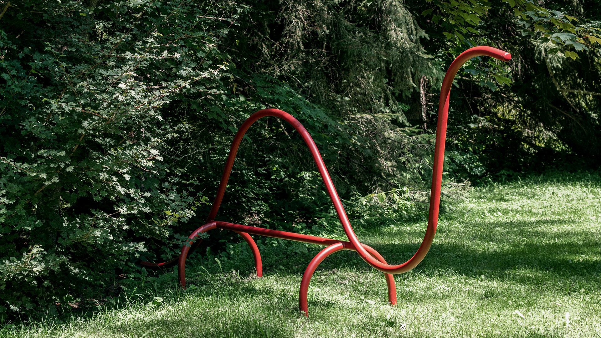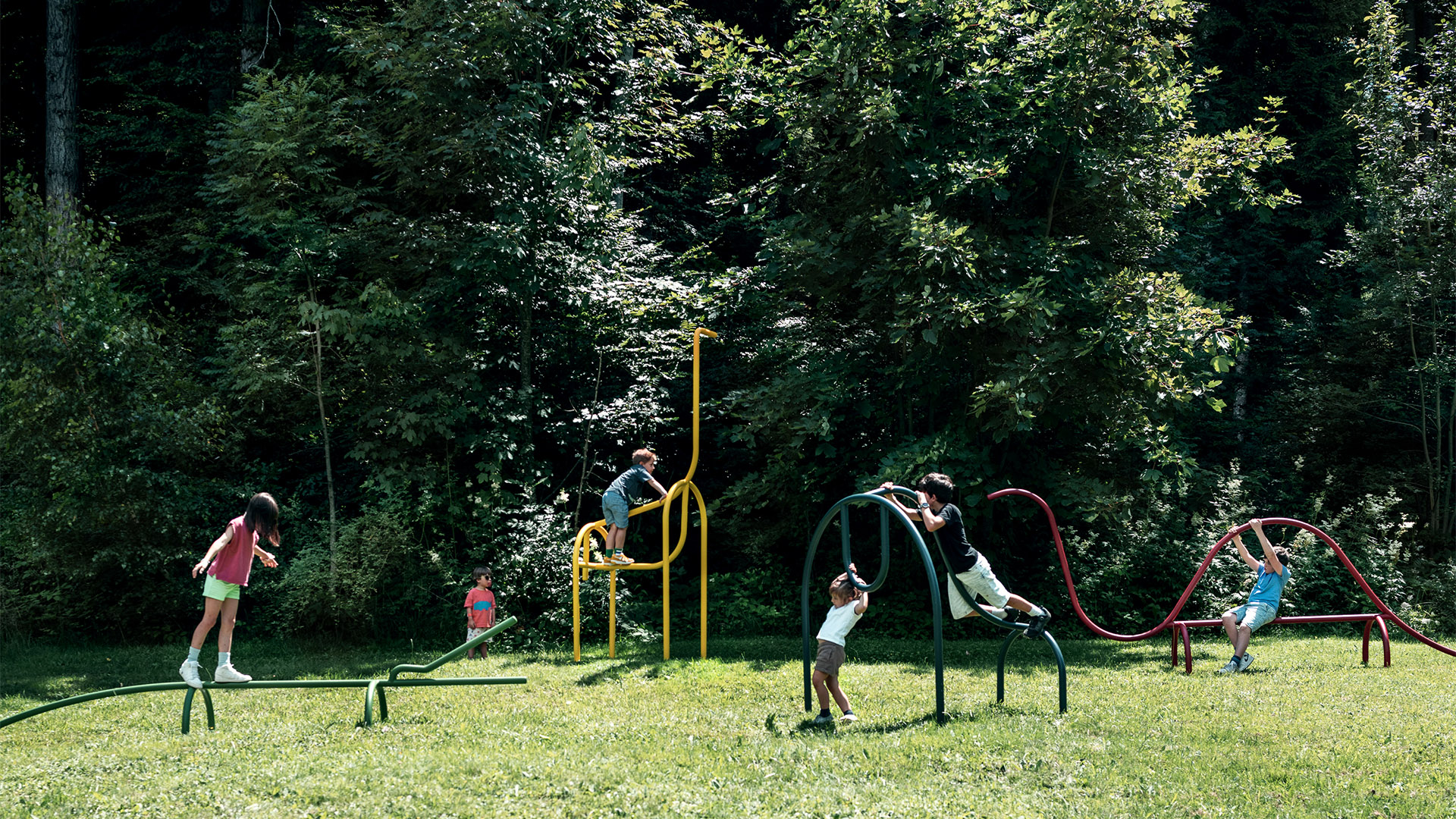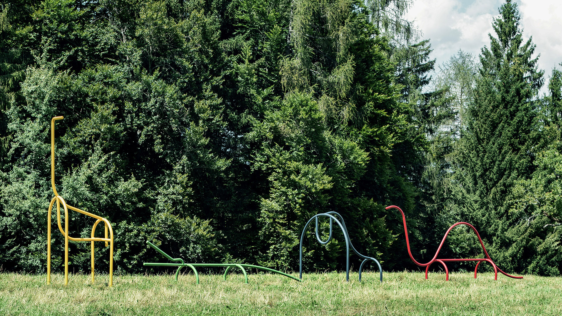 A giraffe, a crocodile, a gorilla and a dinosaur: four animals made of powder-coated steel tube, whose friendly, sinuous and minimalist shape invites interaction, physical training and outdoor life.