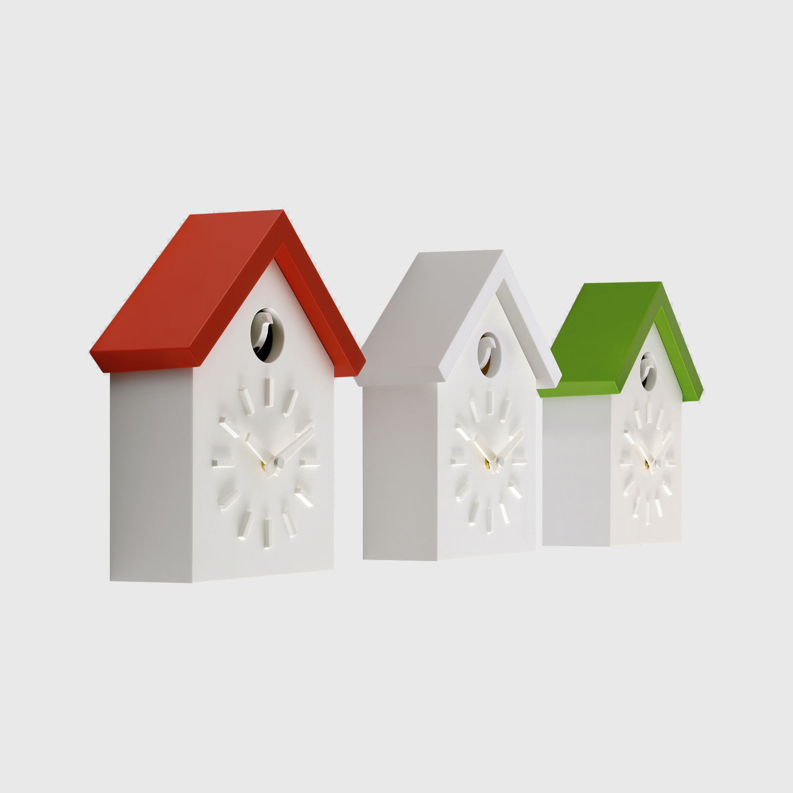 The battery powered clock is in injection-moulded ABS and is available in white with three colours for the roof: orange, green and white.