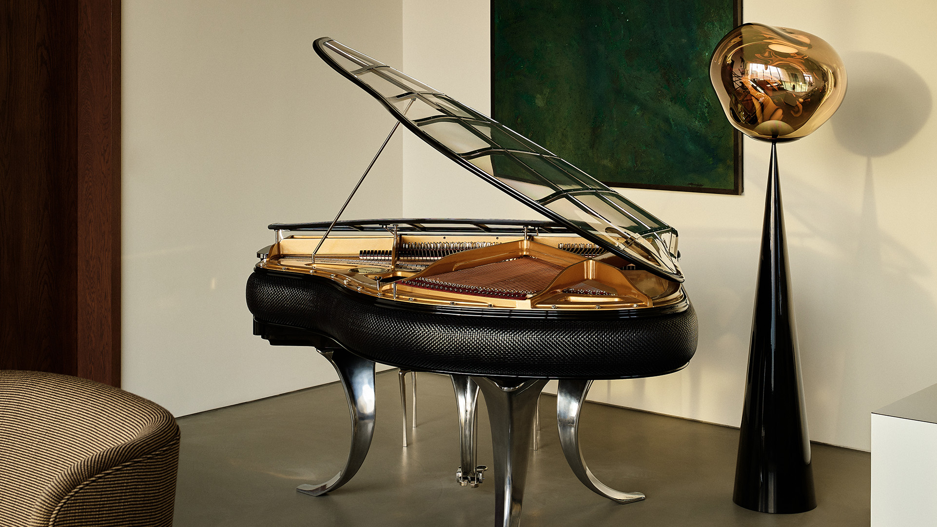 Translucent when on and mirror-finish when off, it emits an attractive, mildly hallucinogenic light. Available in copper, gold, smoke and chrome and as a floor and table standing lamp.
