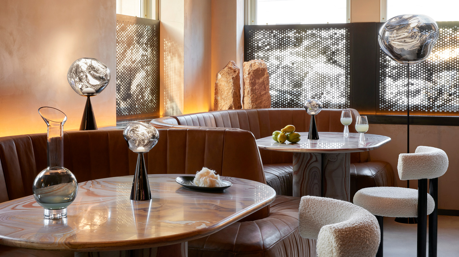 Obsessed with the idea of creating an imperfect, organic and naturalistic lighting object, Melt was created in collaboration with FRONT – a Swedish design collective. Melt is evocative of molten glass, the interior of a melting glacier, or images of deep space.