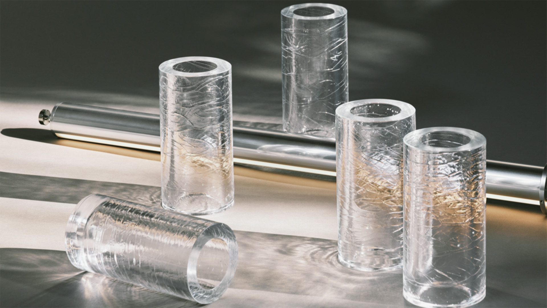 Luce Orizzontale is modular: the range includes three configurations of 8, 10 or 12 cast glass cylinders, suspended and interconnected to form structures of different lengths.