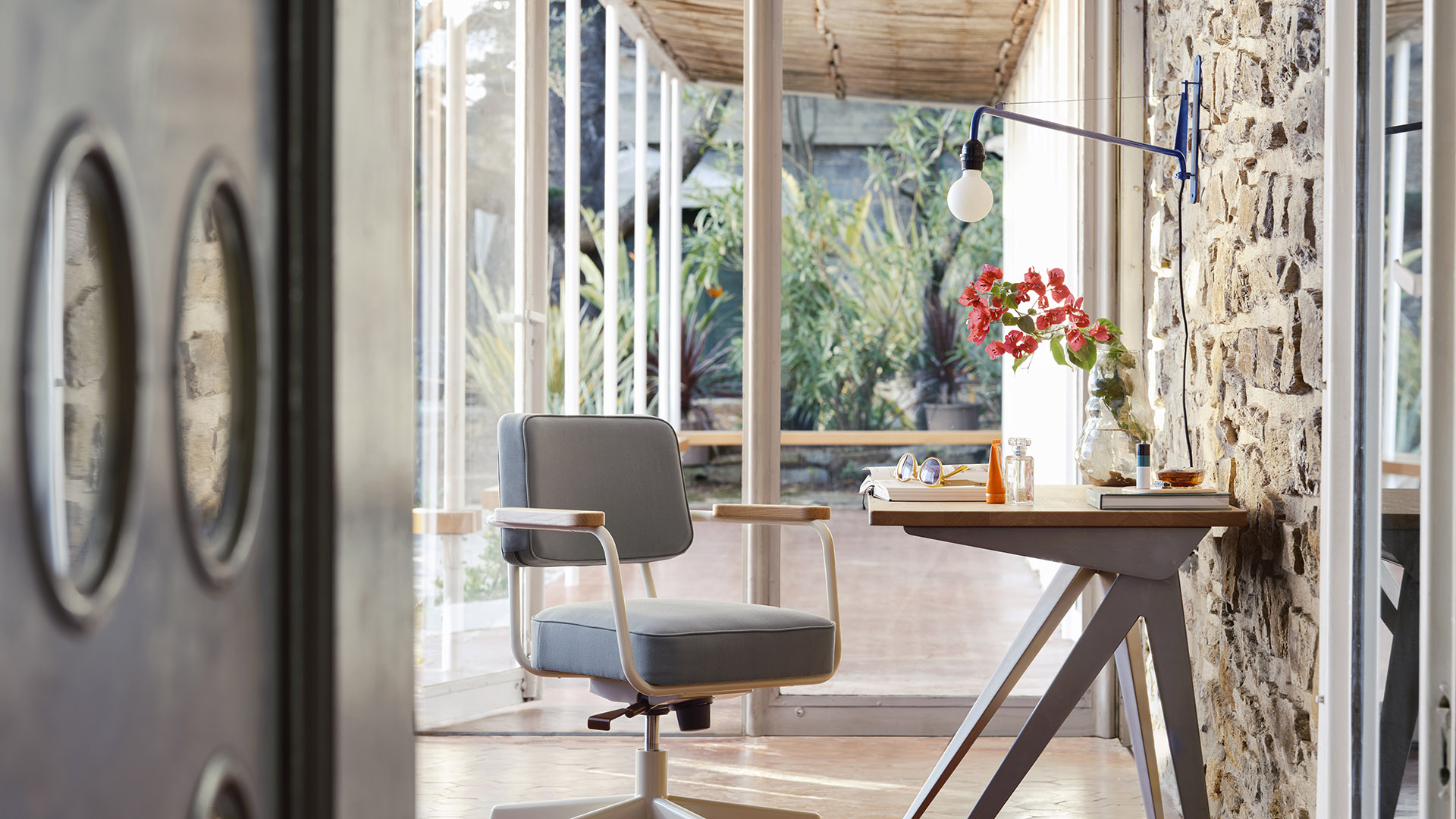 Jean Prouvé created the first version of the Potence wall lamp in the 1940s for his own home in Nancy: a simple light bulb affixed to a long, pivoting steel bar, which is held by a steel wire. This functionalist, puristic design was soon produced in various sizes, with an added handle on larger models to facilitate the swivel movement.