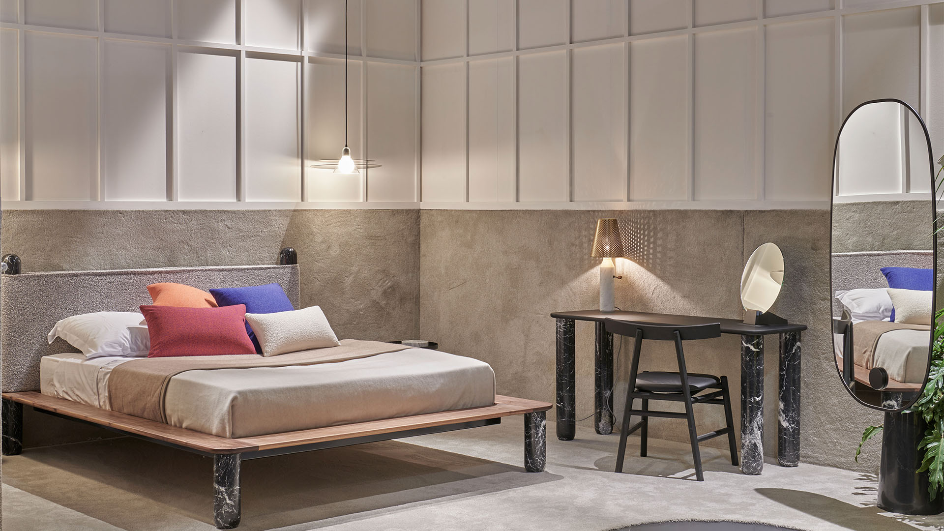Iconic is a mirror that proudly stands like a statue. In marble or oak, the pedestal shape and metal cylinder intersecting both base and mirror contrast with the thickness of the mirror they support.