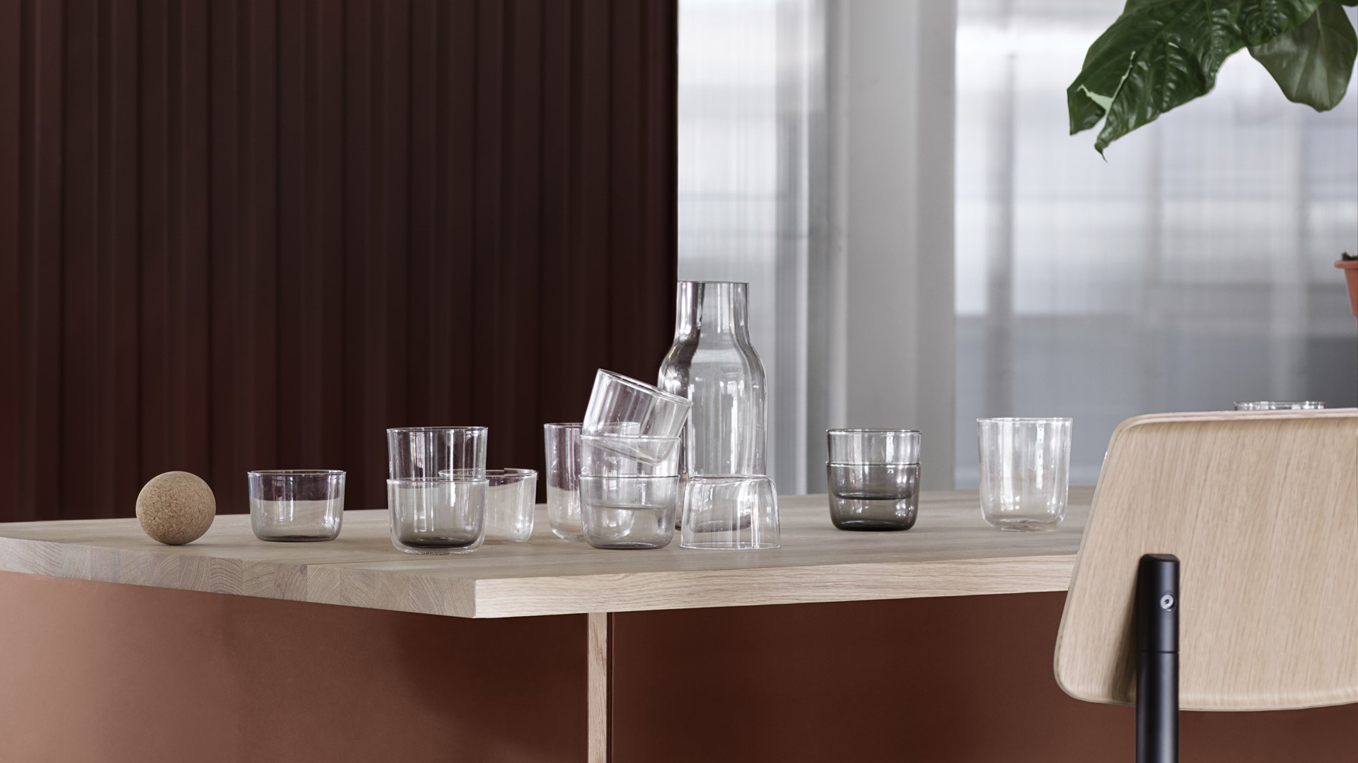 A set of 4 clear drinking glasses. The Corky family of glassware has a simple and familiar form but with a characteristic and oversized detail. Corky glasses are mouth-blown and hand polished.