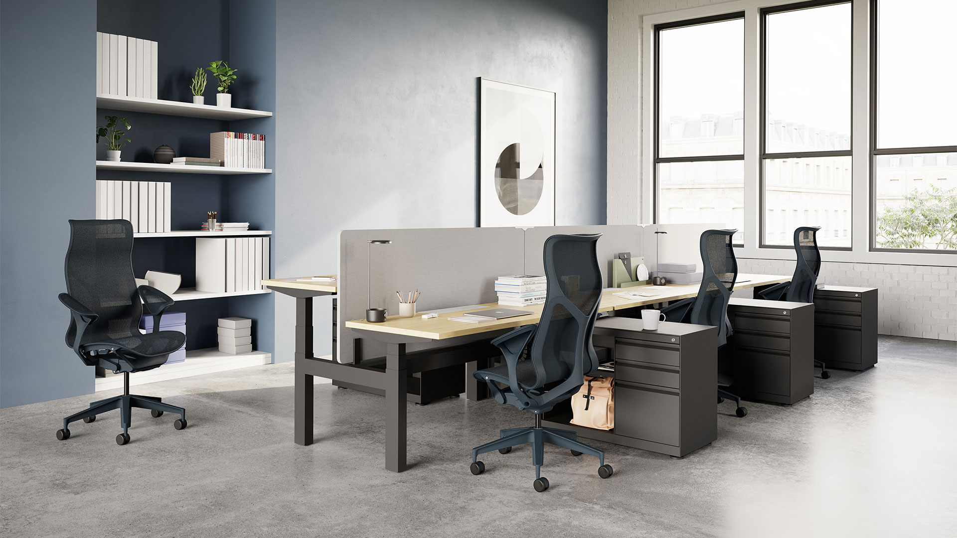 The Ratio height-adjustable desk enables a smooth transition between sitting and standing. Users can vary their posture as they need to find the right balance between sitting and standing throughout the day. Ratio can be specified as single desks or in unlimited clusters, working with our other desking solutions to complete any floor plate.