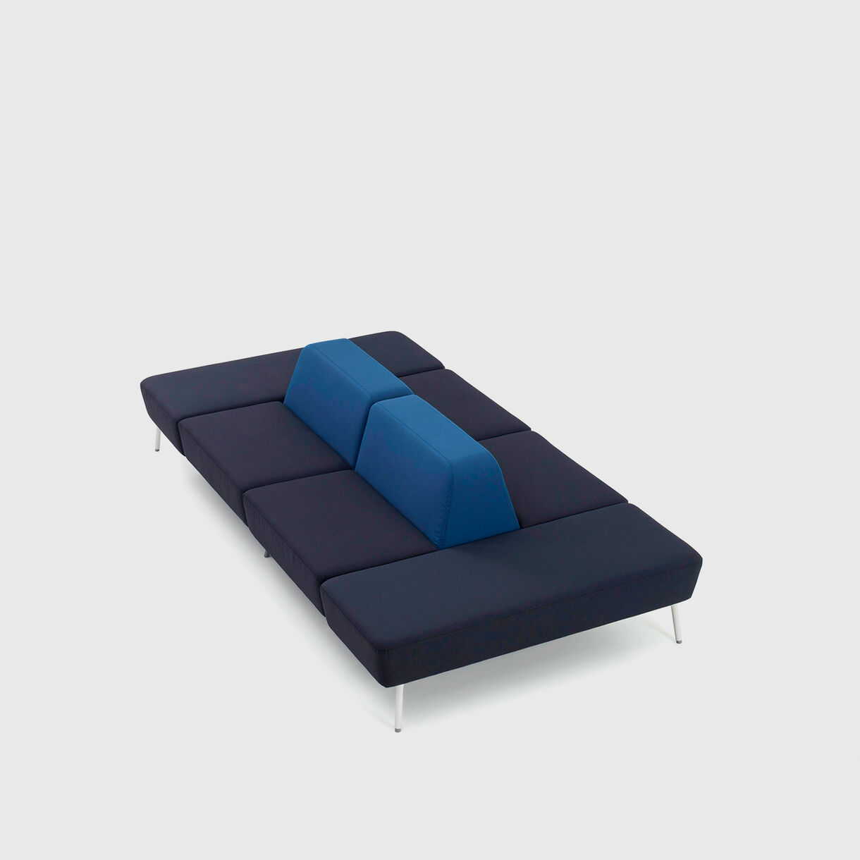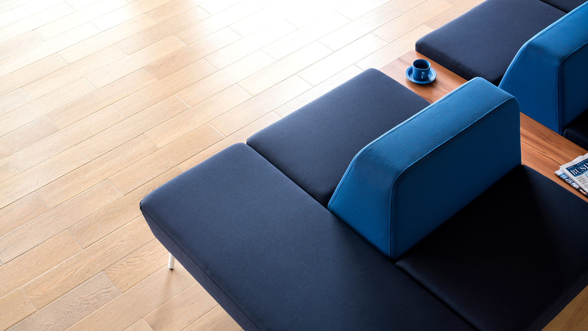 Start with soft seating and built-in surface elements, which connect to Sabha’s twin-beam, four-leg base. To build a larger cluster for a lobby or public area, add recess legs in the centre for more support. In team areas, combine Sabha’s high backrests with shareable, standing surfaces, or use the backrest to create a sense of enclosure. Expand Sabha’s versatility with its accompanying elements: ottomans, coffee tables, stools and on- and off-module armrests.