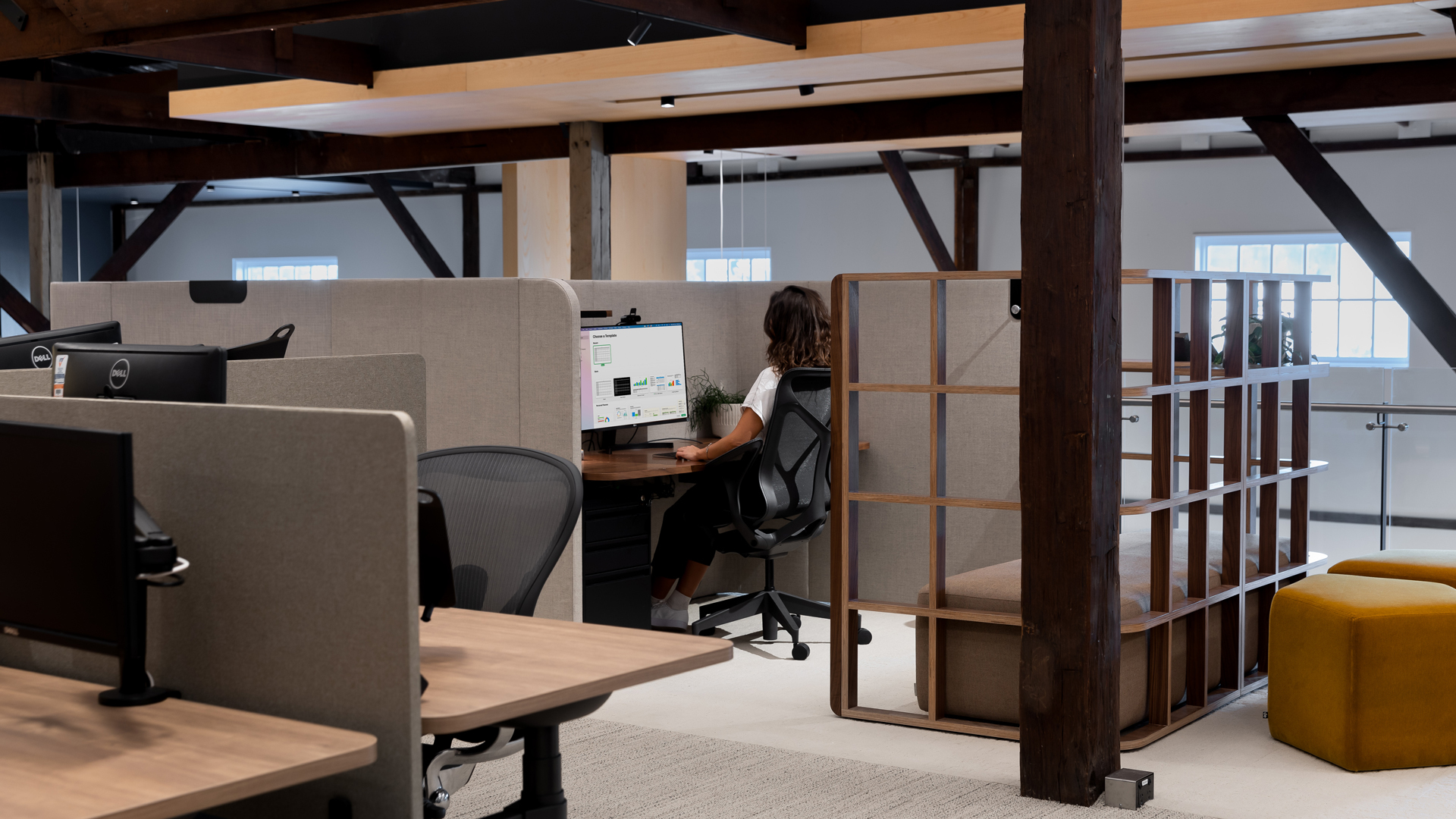A complementary series of upholstered acoustic panels are available. Secured by an interlocking keyhole system, their weight anchors them around the Bloc+s, effectively shrouding the seating elements. As open-planned as today’s office may be, privacy is at a premium.