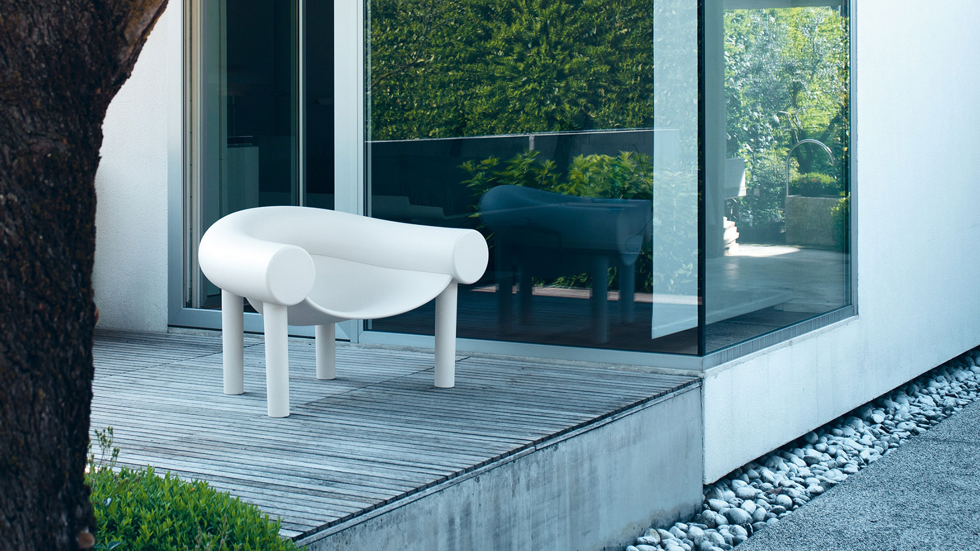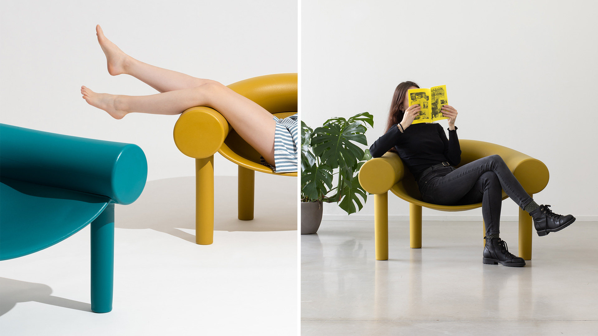 The exaggerated size of the armrest and backrest provides comfort and support and creates a protective space for sitting.