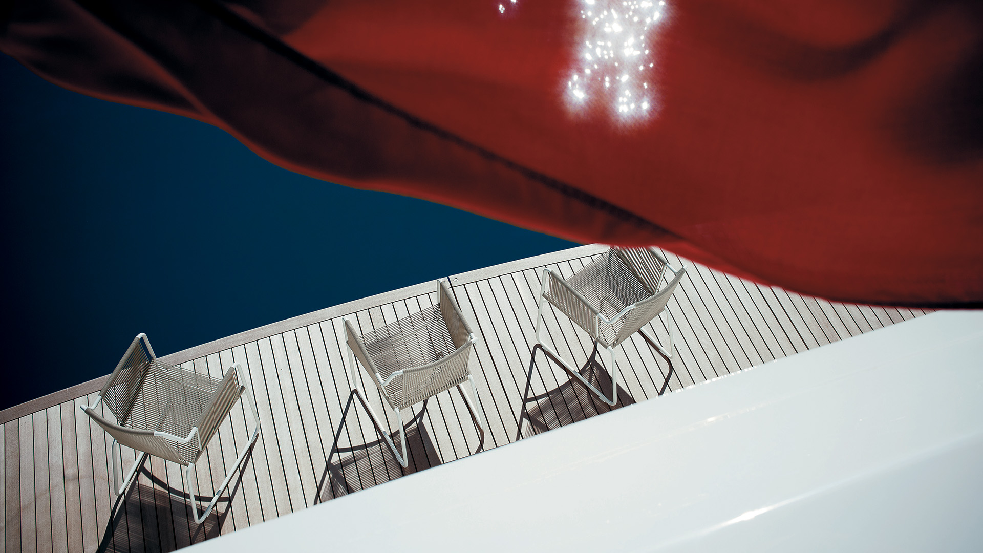 The classic stringed seat finds a new design dimension in this version of outdoor chairs, which also declined in other elements, where polyester trails its infinite filaments around a tubular metal structure in one continuous outline; lightness is given by air vibrating through the cords which celebrate craft manufacturing in the outdoor furniture making, shaping the seat and the back of this collection; neutrality is ignited by cushions, structures or ropes of different thickness and colours.