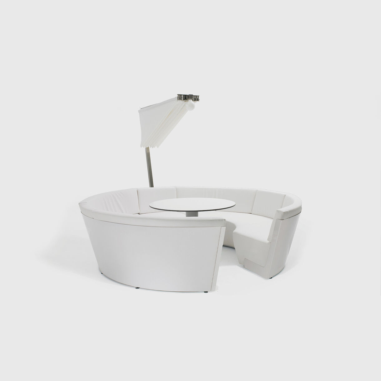 The cushions come in a range of colours and materials, such as leather for indoors and maritime quality fabrics for outdoors. It has a round shape for more intense conversations and cosier cuddling at night. At its lowest position, the optional adjustable table offers a completely flat surface, transforming Kosmos into a giant lounger.