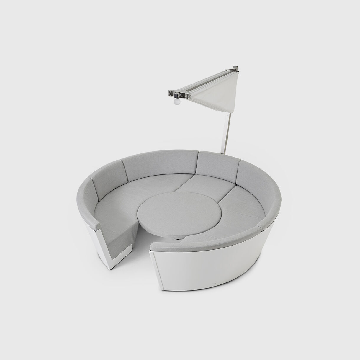 The Kosmos Outdoor Lounge is a clear reference to the world of sailing ships and yachts. The table-seat combination makes efficient use from the space available by combining different functions, such as a sofa, a dining table, light, a parasol, and a daybed (the adjustable table becomes part of the bed). The Kosmos eight-seater is the Swiss knife of the collection, you do not need other furniture when you have this designer sofa.