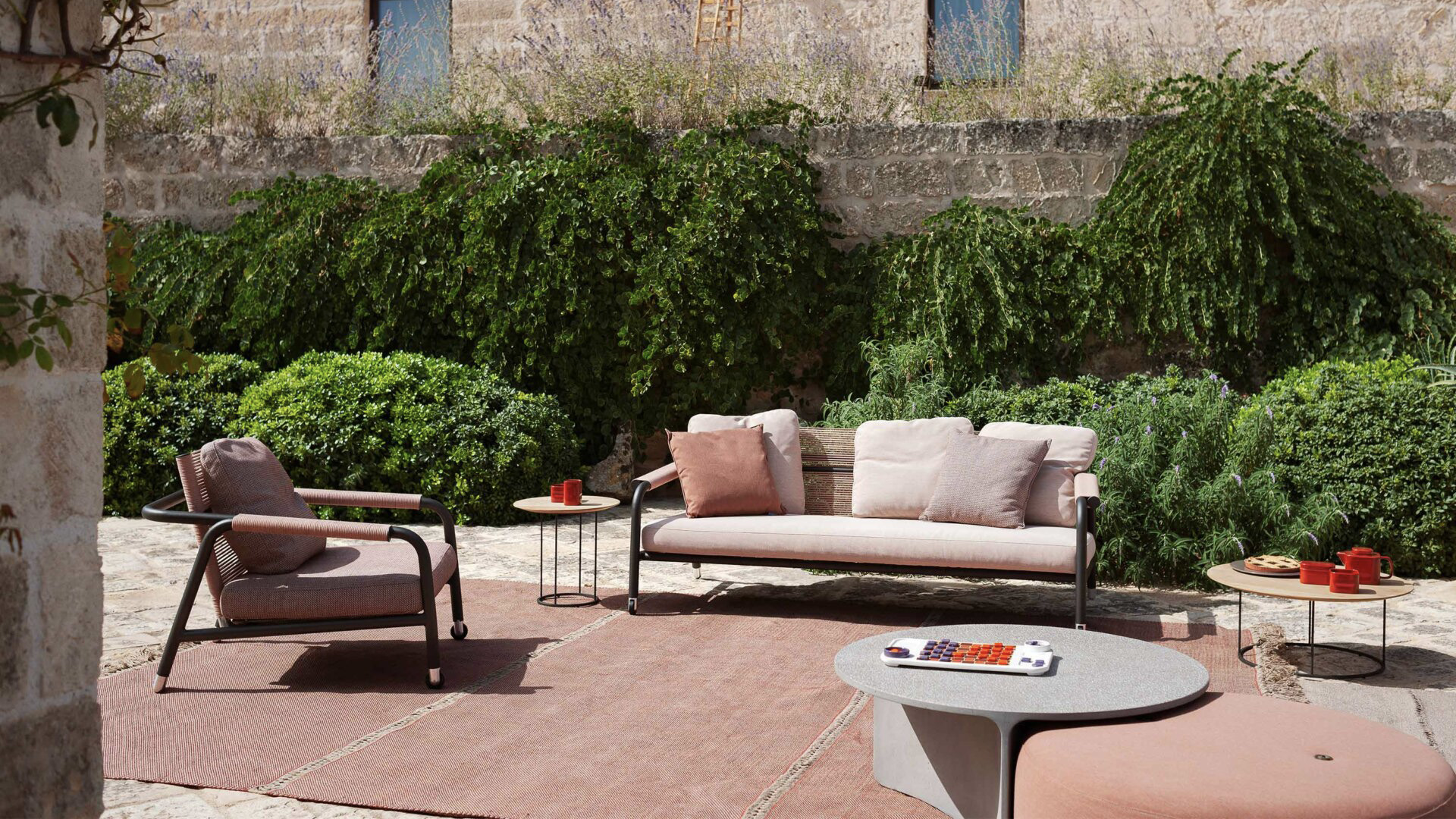 ASPIC outdoor tables − with no legs or feet, but only with sleek vertical walls to support the top − can be juxtaposed to create a game between different heights and arrange spaces in complete freedom, also as a complement for seating and poufs of other RODA collections.