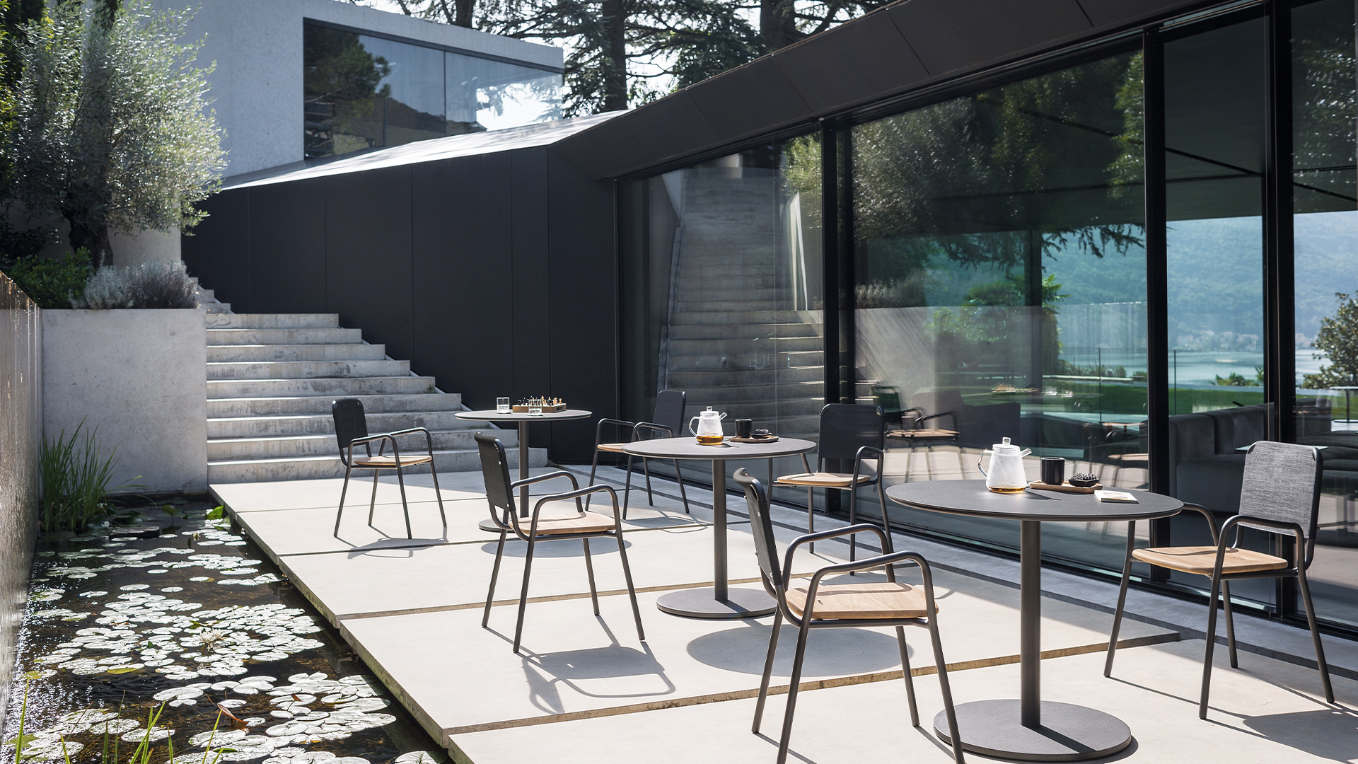 The various proposals of material for the top, in aluminium, or in gres, or in teak, both in the natural wood finish and in the white painted WR finish, BUTTON tables furnish both the contract areas and the residential spaces with simplicity and elegance.