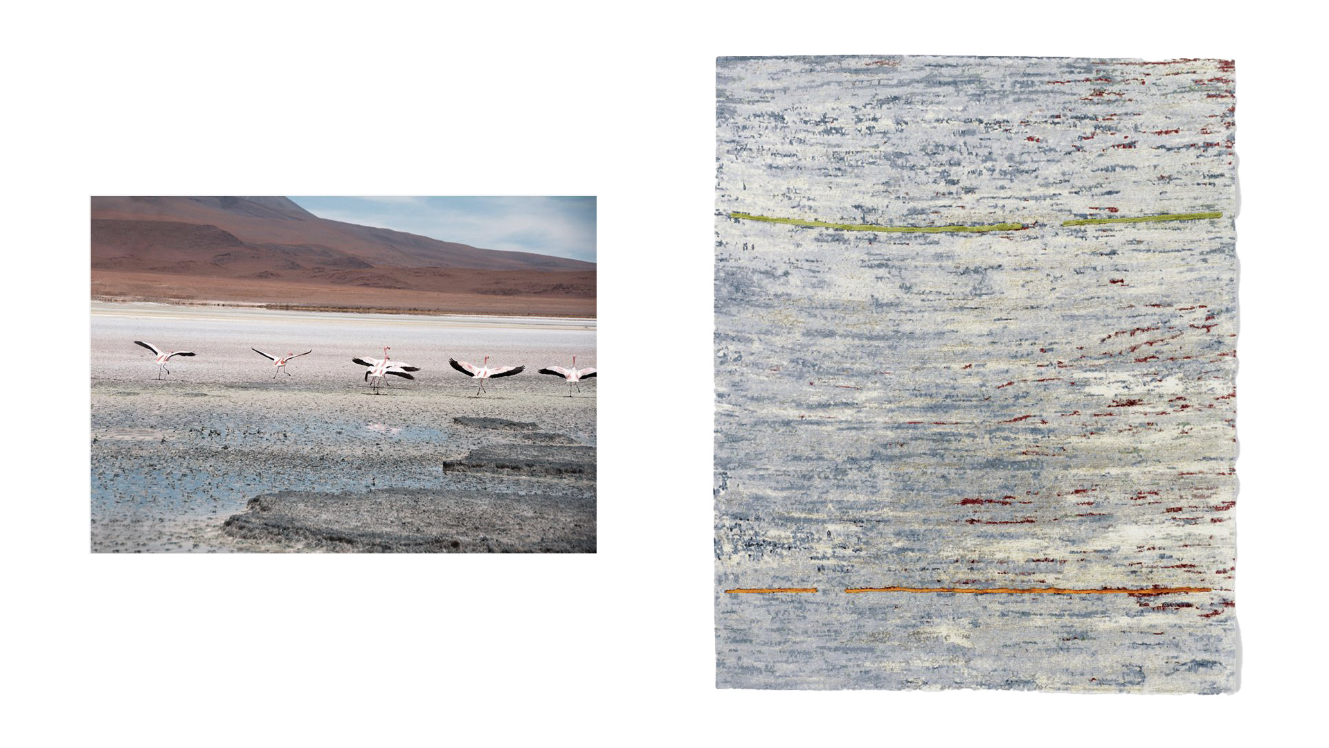 Low-pile carpet made from 55% wool, 25% nettle and 20% silk.