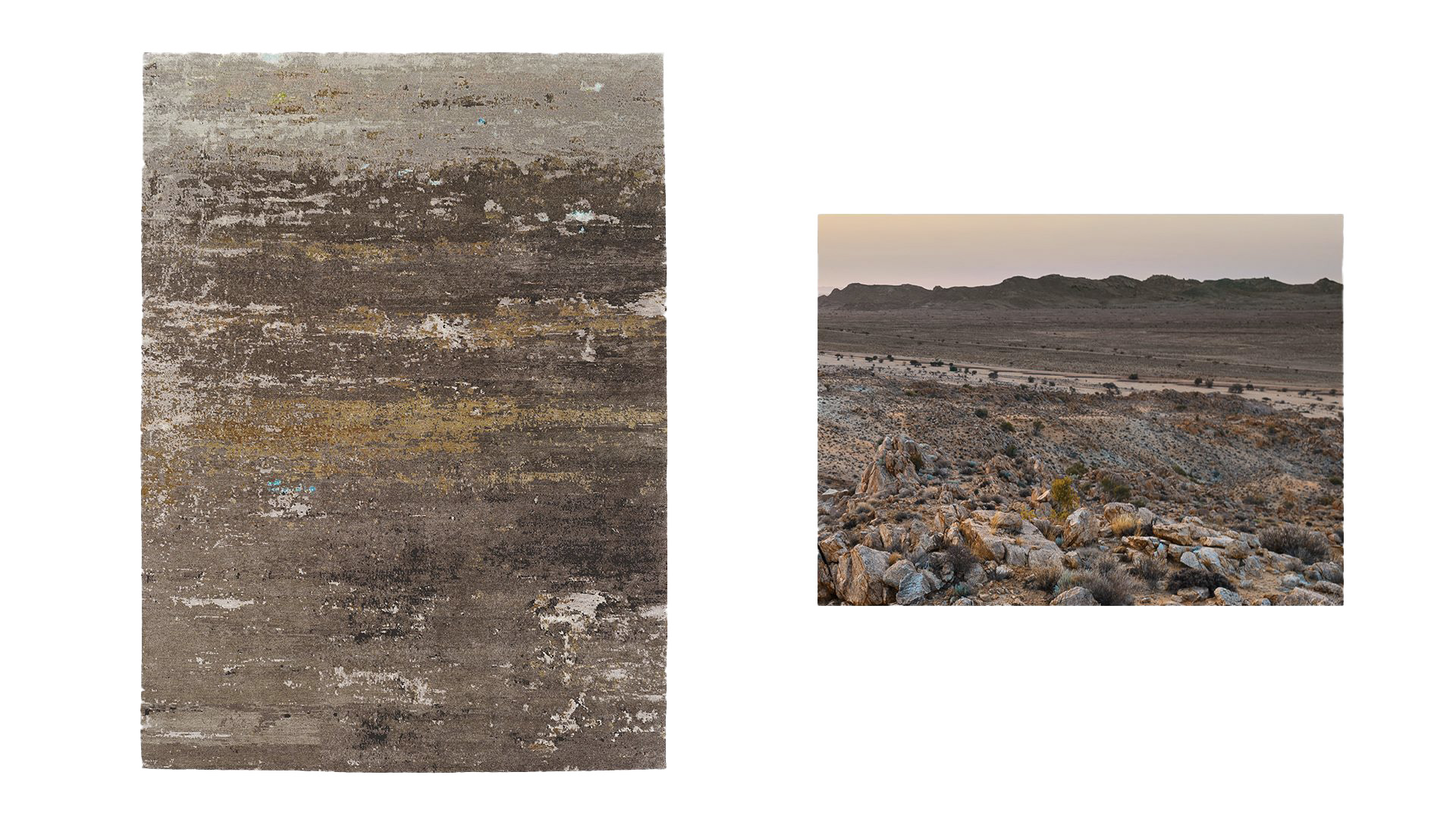This design is named Mwamba, Swahili for stone. Mwamba reflects the barren beauty of the desert: the pile unfolds like layers of rock, while the depth of dark, natural tones is accented by touches of shimmering blue.