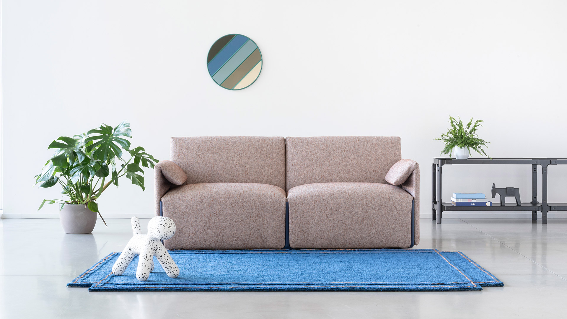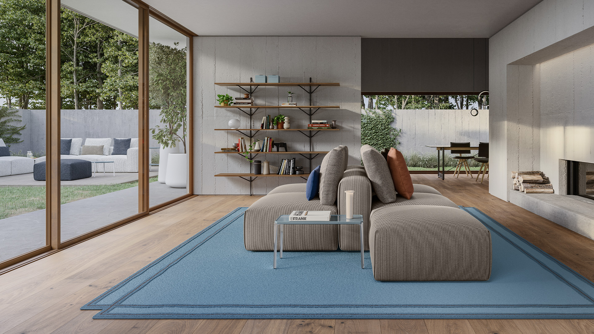 “I wanted to make simple, quiet and almost neutral rugs, lit up by slim, bright and luminous bands like neon strips. Volentieri is a collection of rugs available in two models: Cornice, which appears as an overlapping of two rugs, one on the other, and Finestra, which appears instead as three overlapping rugs. This creates a very characteristic shape yet one which is easy to use. In each of them we find a group of weaves and yarns of a different type: weaving both in velvet and bouclé and shiny viscose on matte linen.