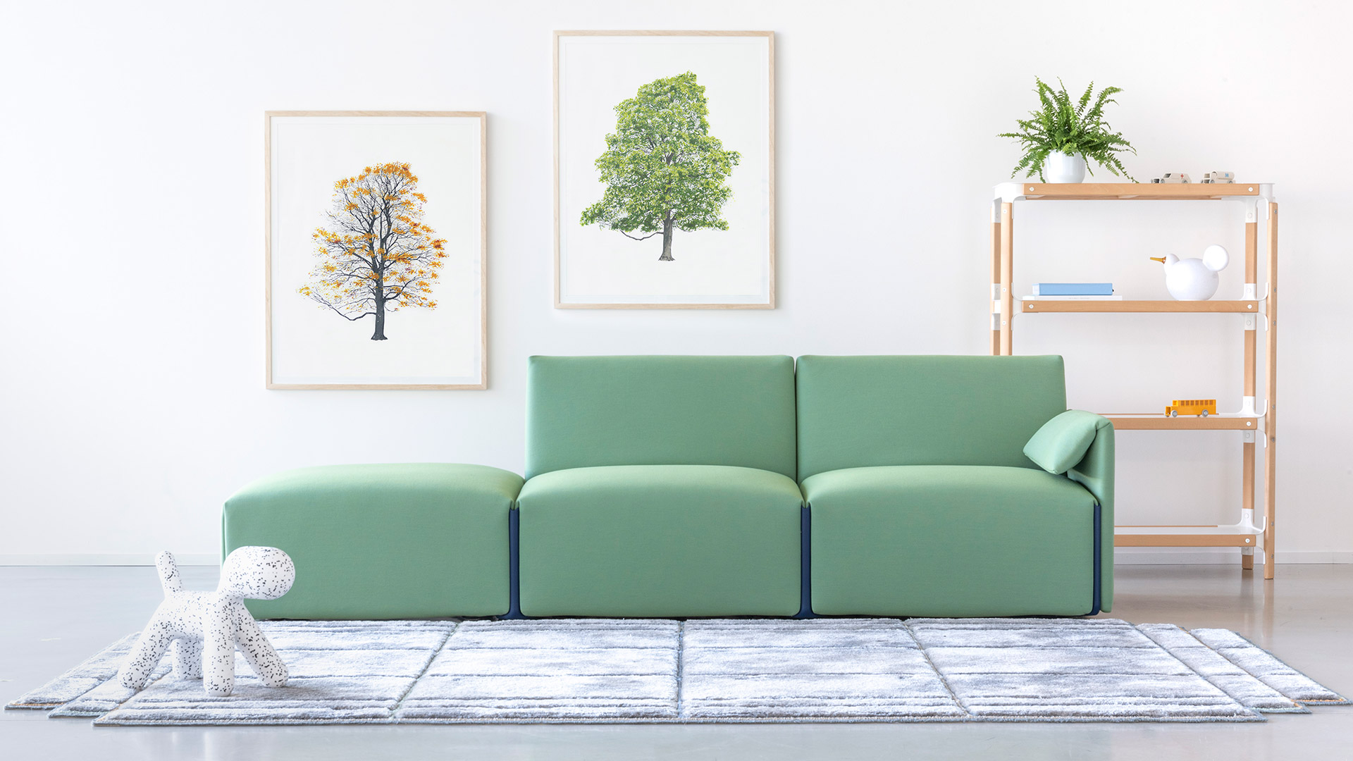 Cornice is made up of two squares of matte linen in bouclé outlined by an edge in shiny viscose velvet. On the Finestra model, however, rectangles of thick and very soft viscose velvet are separated from each other by slim lines of linen and viscose with a bouclé weave”. Inga Sempé