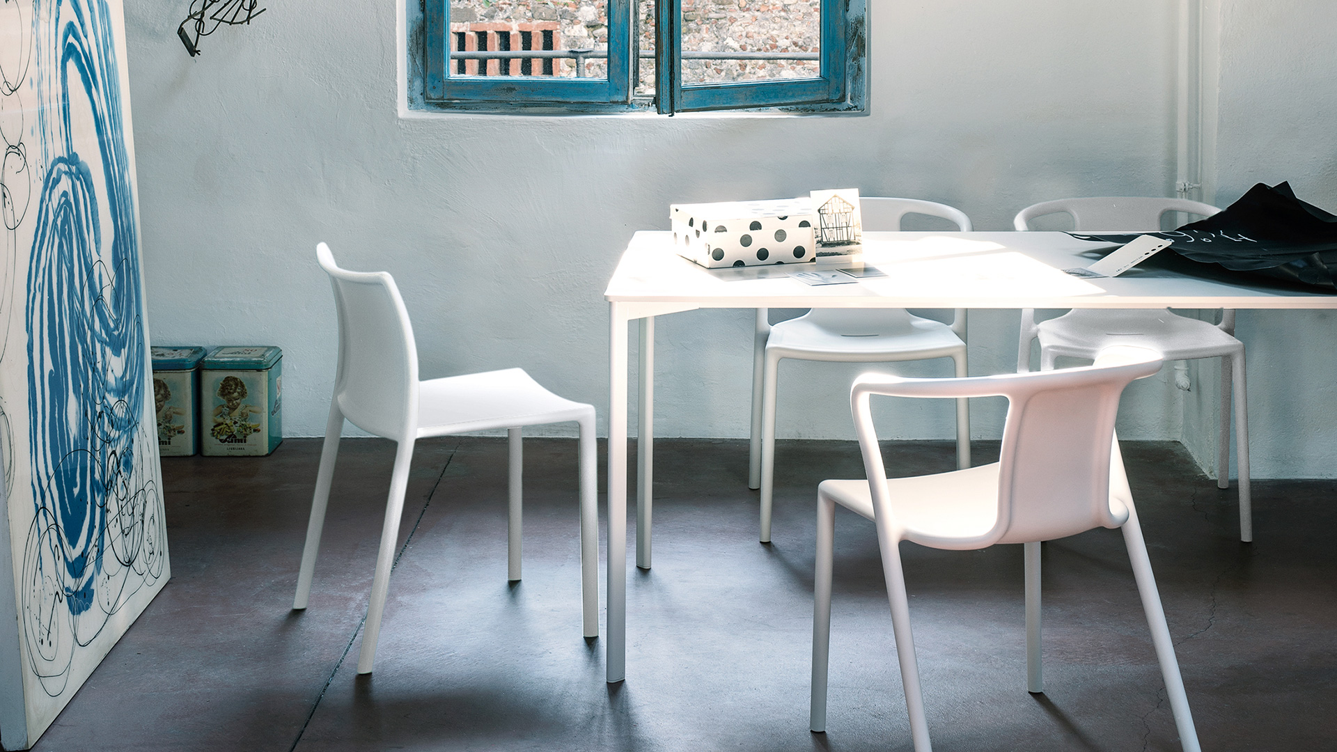Harmonious, dynamic, stackable, and suitable for indoor or outdoor use, table and chairs create a welcoming atmosphere anywhere: at home or in a collective space, in the kitchen, the dining room or the garden. The products are available in a range of colours to suit any taste and style. The chairs come with or without armrests and are also available as foldable versions.