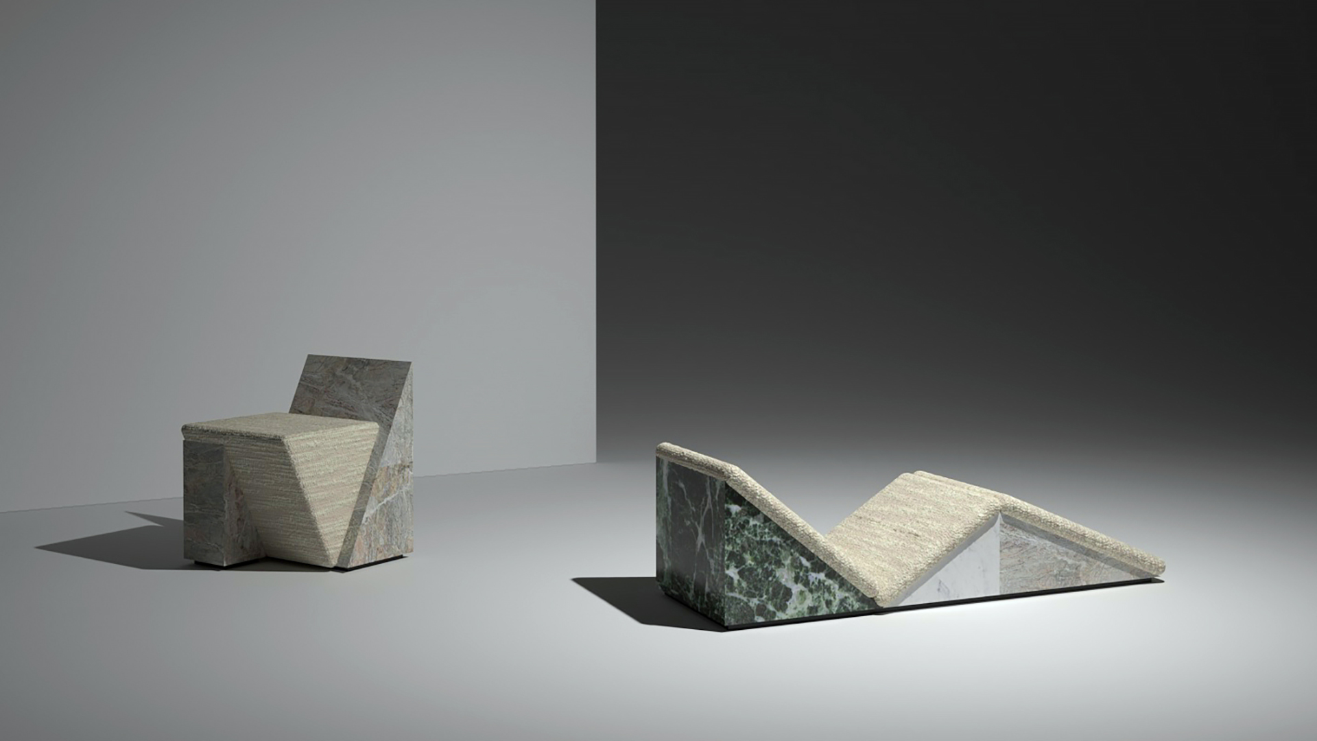 To augment the seating comfort, an oversized cushion with a materic Lelievre fabrics covers the entire chaise longue. This lounge chair presents a radical and severe formal shape composed of juxtaposed triangular shapes. This apparently simple form is rendered possible through a complex inner structure that allows the production to use marble of an ecologically reasonable thickness.