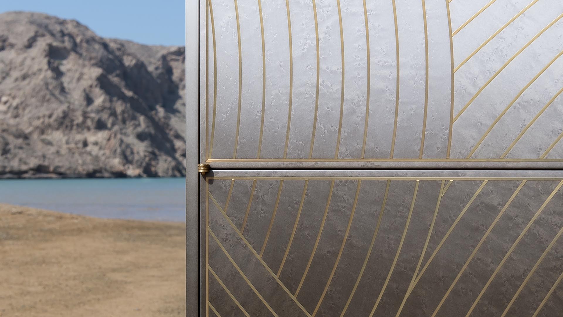 Bethan has captured the movement of the sails in a hand-drawn pattern and with the play of the light by matching the direction of the veneer to the curved sections of solid metal. The sweep of the Dhow pattern is meticulously crafted in Muscat by master craftspeople from over 60 linear metres of solid brass, copper or nickel and paired with precision hand-made bespoke hinges.