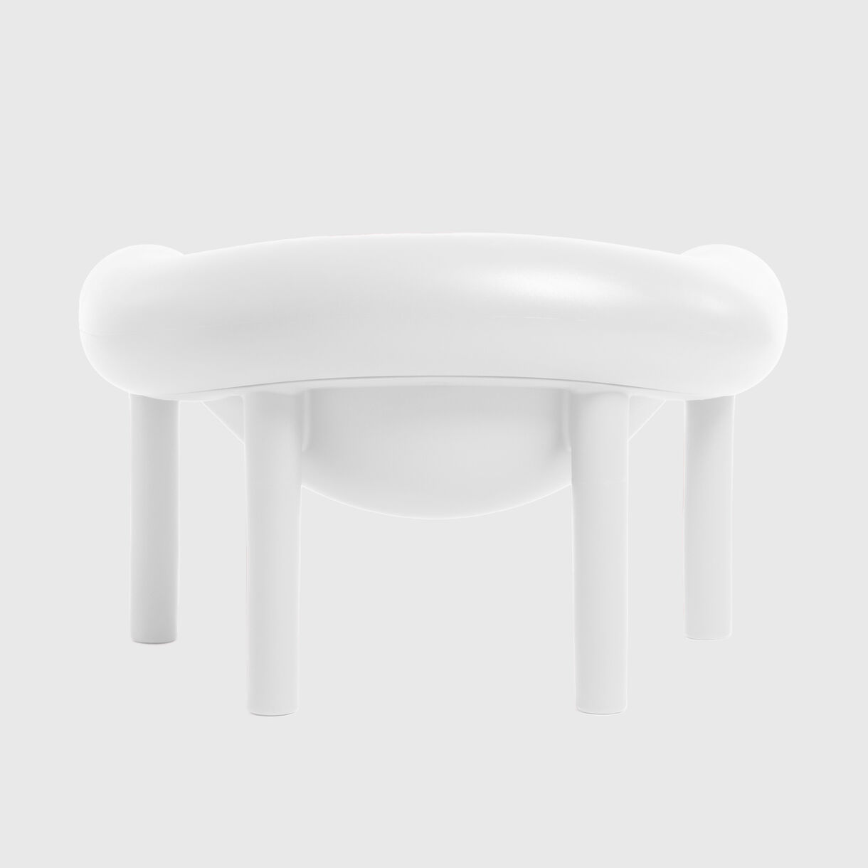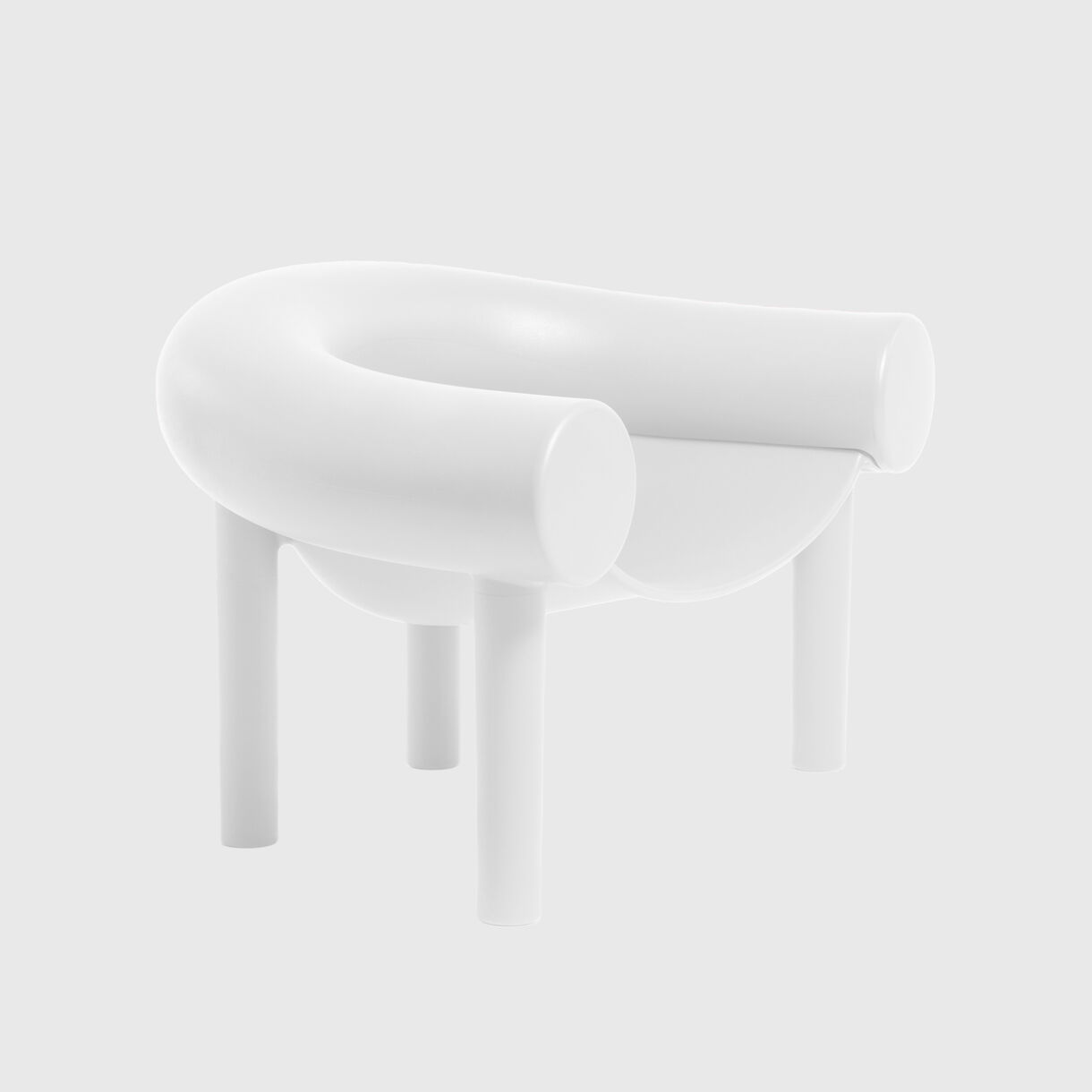 An easy armchair with a hint of a cartoon character. Supported on four stilt legs, the armchair features a softly suspended seat shell between a giant, horseshoe-shaped element, the chair’s characteristic armrest and backrest.